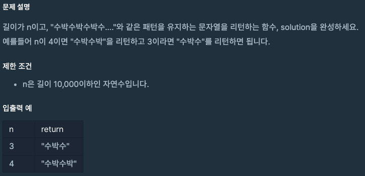 return n % 2 === 0 ? "์๋ฐ".repeat(n / 2) : "์๋ฐ".repeat(n / 2) + "์";