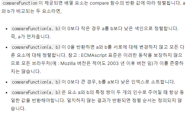 - sort๋ compareFunction ๋ผ๋ ์ฝ๋ฐฑํจ์๋ฅผ ์ธ์๋ก ๋ฐ์ ์ ์๋๋ฐ ์ด๋ ๋ฒ์น์ด ์๋ค.