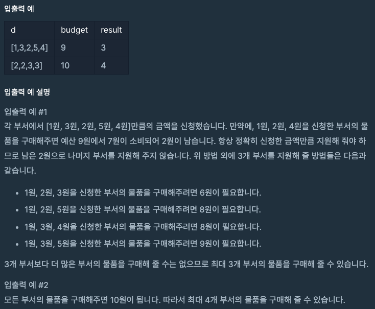 1. ๋ฐฐ์ด์ ์ค๋ฆ์ฐจ์์ผ๋ก ์ ๋ ฌ์ ํด์ฃผ๊ณ reduce๋ฉ์๋๋ฅผ ๋์ ๊ฐ์ ํ์ฌ๊ฐ์ ๋ํ๋ ๋์ค if๋ฌธ์ผ๋ก budget ๋ณด๋ค