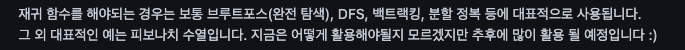์ฌ๊ทํจ์๋ฅผ ์ฃผ๋ก ์ฌ์ฉํ๋ ์๊ณ ๋ฆฌ์ฆ ๋ฑ.. ์๊ฐ ๋ ๋ ํ๋์ฉ ์ฐพ์์ ์ ๋ฆฌํด๋ณด์.