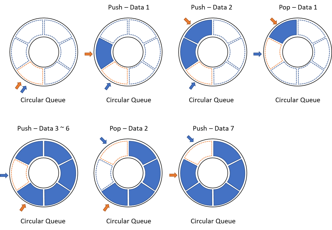 - ์ํ ํ๋ ๋ฐ์ดํฐ๋ฅผ ๊ฐ์ ธ์ค๋ ๋ฐฉํฅ์ด ์๋ ๊ตฌ์กฐ์ด๋ค. ๋์ ํ์ ํฌ๊ธฐ๊ฐ ์ง์ ๋์ด ์์ด์ผ ํ๊ณ front์ rear์ ์์น๋ฅผ ๊ณ์ฐํด ํ๋์ ๋น๊ณต๊ฐ์ ๋จ๊ฒจ์ผ ํ๋ค. ( size๊ฐ 6์ด๋ฉด ์ค์ ์ฌ์ฉํ ์ ์๋ ๊ณต๊ฐ์ 5๋ค. )