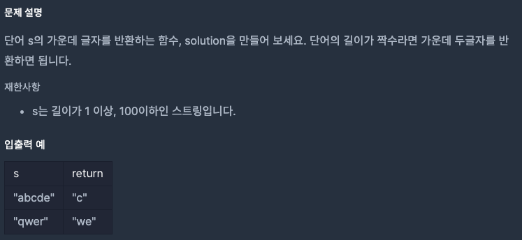 s.length๊ฐ ์ง์์ผ ๊ฒฝ์ฐ ๊ฐ์ด๋ฐ 2๊ฐ์ ๋ฌธ์์ด, ํ์์ผ ๊ฒฝ์ฐ ๊ฐ์ด๋ฐ ๋ฌธ์์ด 1๊ฐ๋ฅผ ๋ฐํํ๋ค.