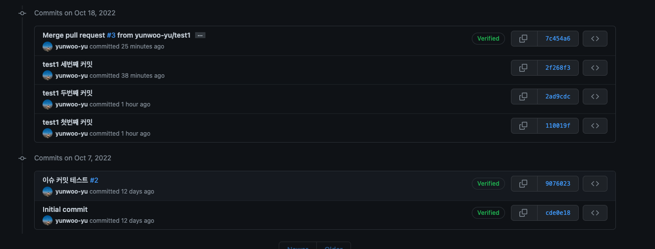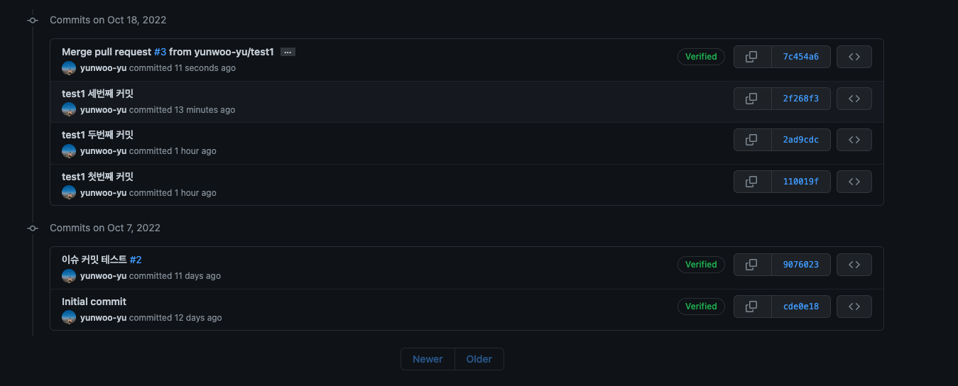 - main ๋ธ๋์น ์ปค๋ฐ๋ด์ญ์ ๋ณด๋ฉด 3๊ฐ์ ์ปค๋ฐ๊ณผ ๋จธ์ง ์ปค๋ฐ์ด ๋จ์์๋ค. ๋ด๊ฐ ๋์๊ฐ๊ณ ์ถ์ ์์ ์ ์ด์ ์ปค๋ฐ ํ ์คํธ #2 ๋ถ๋ถ์ด๋ค.