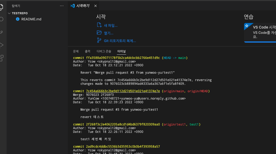 - ๋จธ์ง ํ ์๊ฒผ๋ test1.js, test2.js ํ์ผ์ด ์ญ์ ๋ ๋จธ์ง ์ด์ ์ผ๋ก ๋์๊ฐ๋ค.