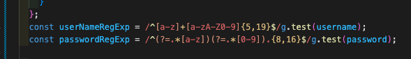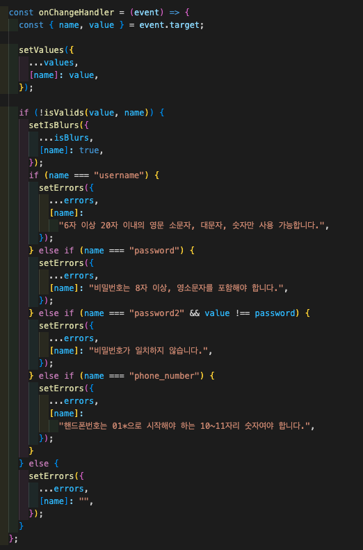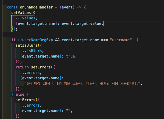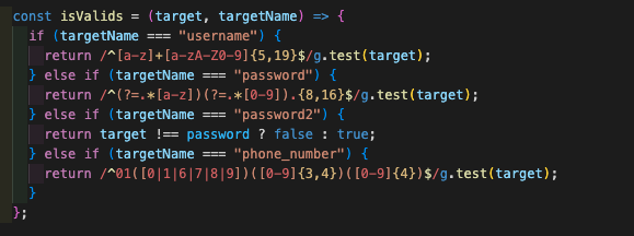 - 이런식으로 onChange를 감지하며 변경해 주었는데 문제는 유효성 test 정규표현식을 만든 변수에 직접 state값을 넣으니 발생한 문제였다.